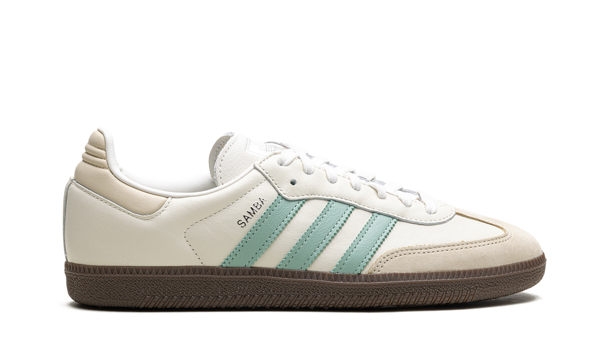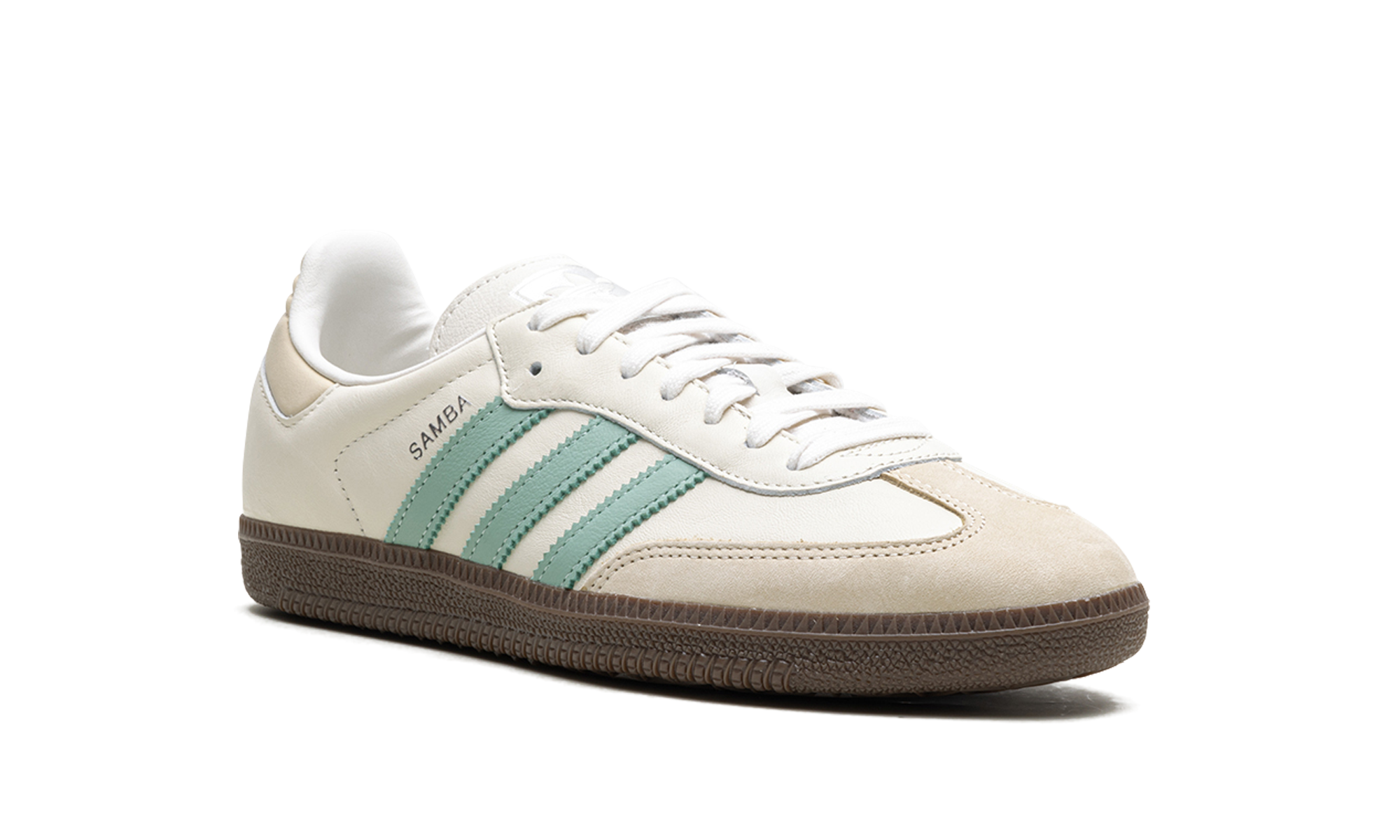 The Women’s adidas Samba OG “Hazy Green” is a women’s-exclusive colorway of the retro soccer shoe with green features. The upper is complete with a Cloud White leather design and Hazy Green leather Three Stripes branding. Wonder White accenting appears on the leather overlays on the toe and heel. Classic “Samba” branding can be found on the lateral side of the mid-panel, while “adidas” branding appears on the tongue. Underfoot, a dark gum rubber sole completes the look.